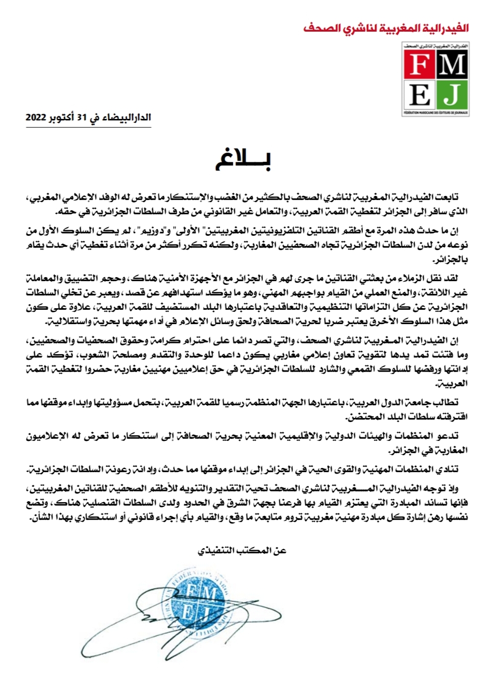 إن الفيدرالية المغربية لناشري الصحف، والتي تصر دائما على احترام كرامة وحقوق الصحفيات والصحفيين، وما فتئت تمد يدها لتقوية تعاون إعلامي مغاربي يكون داعما للوحدة والتقدم ومصلحة الشعوب، تؤكد على إدانتها ورفضها للسلوك القمعي والشارد للسلطات الجزائرية في حق إعلاميين مهنيين مغاربة حضروا لتغطية القمة العربية.