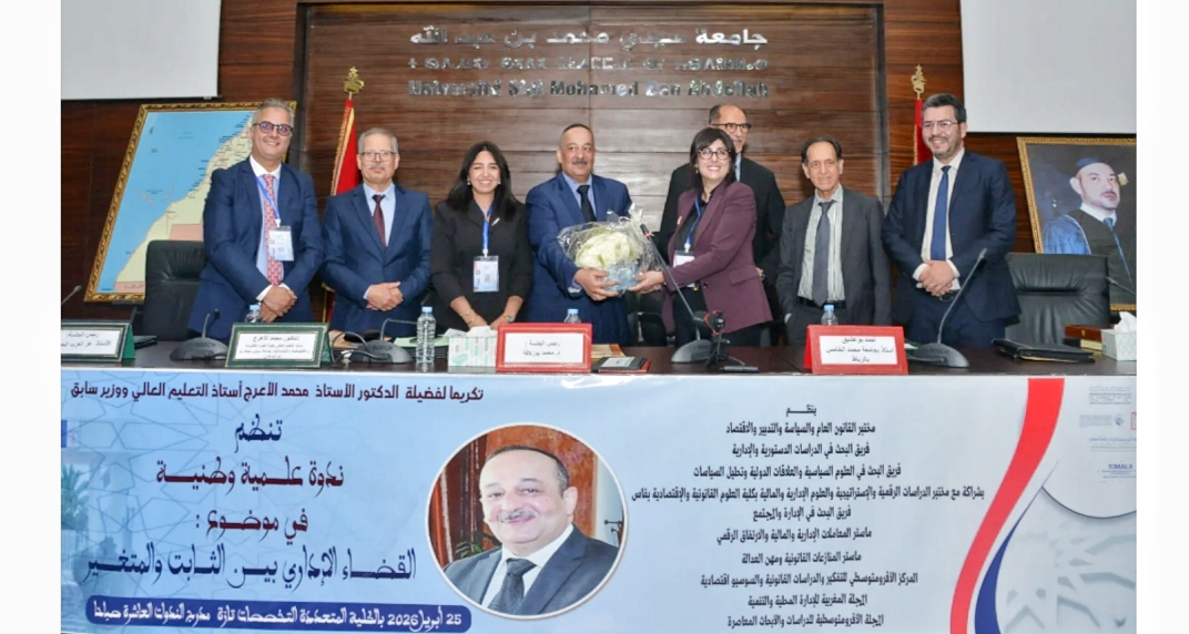 احتضنت الكلية متعددة التخصصات بتازة، يوم السبت 25 أبريل 2026، ندوة علمية وطنية متميزة في موضوع: “القضاء الإداري بين الثابت والمتغير”، وذلك تكريماً للأستاذ الدكتور محمد الأعرج، الأستاذ الجامعي ووزير الثقافة والاتصال السابق، في مبادرة أكاديمية تعكس ثقافة الاعتراف بالمسارات العلمية الرائدة في مجال القانون العام.